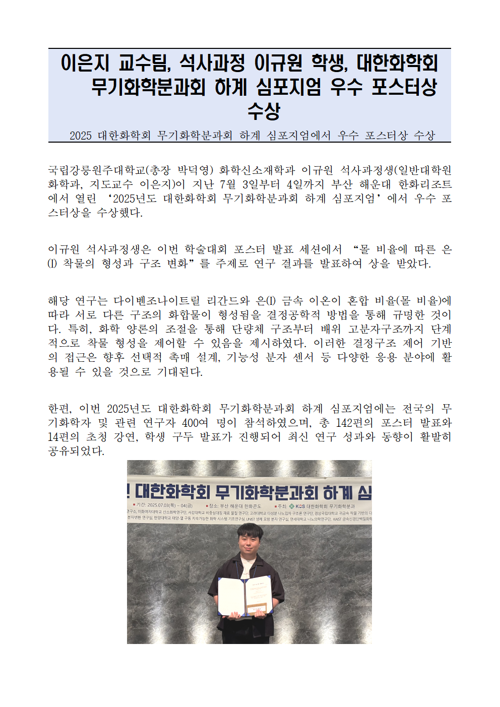 이은지 교수팀, 석사과정 이규원 학생, 대한화학회 무기화학분과회 하계 심포지엄 우수 포스터상 수상