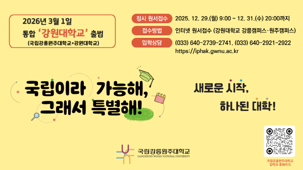 국립강릉원주대학교는 2026년 3월 1일부터 국립강릉원주대학교와 강원대학교가 통합 ‘강원대학교’로 출범함에 따라, 2026학년도 신입생을 ‘강원대학교 강릉캠퍼스·원주캠퍼스’로 모집한다.