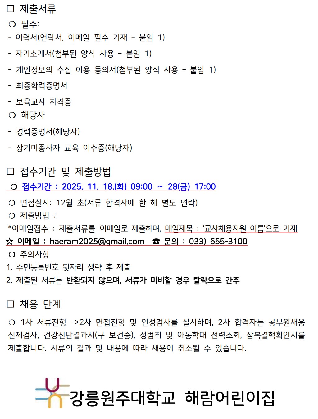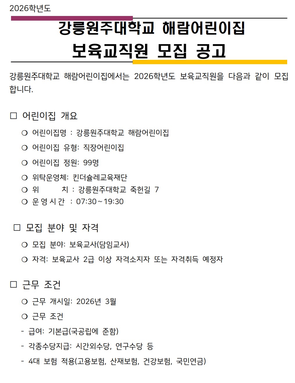 fnctId=bbs,fnctNo=208 강릉원주대학교 해람어린이집 보육교직원 모집 공고 작성일 2025.11.17 작성자 신시원 조회수 728 첨부파일 해람_교사채용지원양식.hwp 다음글 강원특별자치도자연학습원 직원 공개 채용 신시원 2026-01-12 10:57:21.0 이전글 해군1함대 사랑Dream 어린이집 교직원 채용 신시원 2025-11-10 14:40:03.0 총 16 개의 게시물이 있습니다. 게시물 검색 제목 작성자 게시글 리스트 취업정보 번호 제목 작성자 작성일 댓글 조회수 첨부파일 16 강원특별자치도자연학습원 직원 공개 채용 신시원 2026.01.12 0 293 1 15 강릉원주대학교 해람어린이집 보육교직원 모집 공고 신시원 2025.11.17 0 728 1 14 해군1함대 사랑Dream 어린이집 교직원 채용 신시원 2025.11.10 0 514 0 13 2025학년도 봉대초등학교병설유치원 하계 방학 중 방과후과정 인력 채용 공고 신시원 2025.06.20 0 2064 0 12 하이원 정선 어린이집(강원랜드 직장어린이집(한솔보육재단)) 보육교사 채용 공고 신시원 2024.07.17 0 5849 0 11 <원주소방서어린이집 담임교사 구인> 신시원 2024.03.11 0 5810 0 10 근로복지공단 동해어린이집 보육교직원 채용 공고 신시원 2023.11.24 0 4038 0 9 푸른자연 유치원 교사 구인 안내 신시원 2023.08.14 0 1727 0 8 2023년 강릉원주대학교 해람어린이집 교사 채용공고 신시원 2022.12.14 0 2197 2 7 근로복지공단 동해어린이집 보육교사 채용 공고 신시원 2022.11.23 0 2231 0 처음 12 1 2 다음 페이지 끝