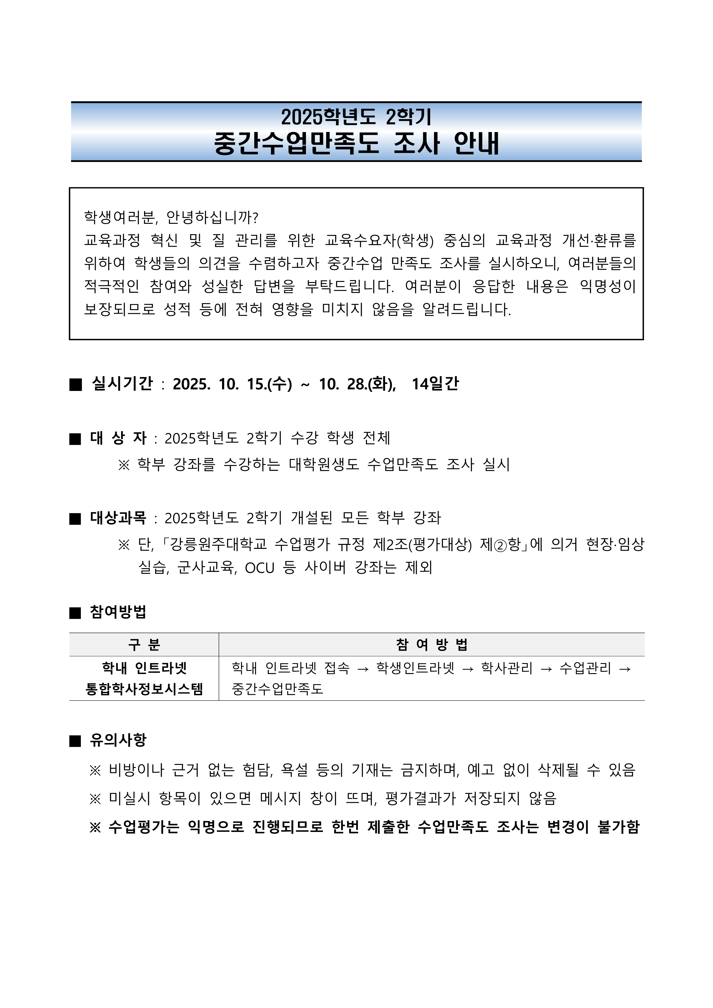 fnctId=bbs,fnctNo=877 2025학년도 2학기 중간 수업만족도(수업평가) 조사 안내 및 협조 요청 작성일 2025.10.02 작성자 정하나 조회수 794 첨부파일 3. 강릉원주대학교 중간수업만족도 매뉴얼(학생용)-2-3.pdf