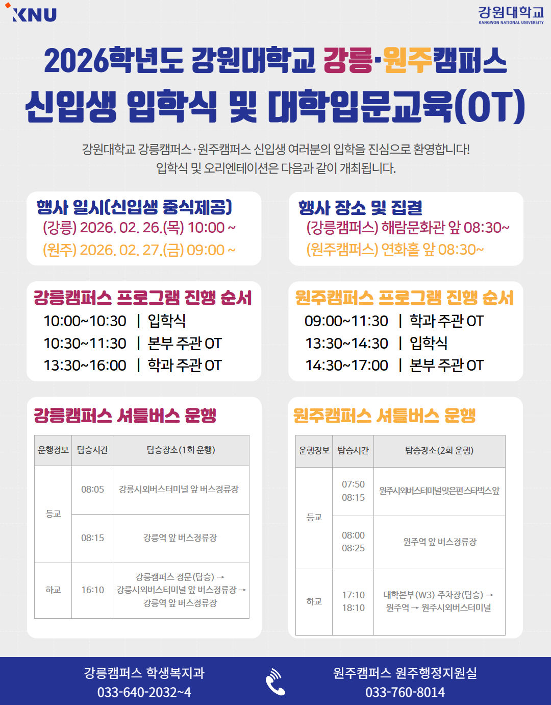 fnctId=bbs,fnctNo=1606 2026학년도 강원대학교 강릉·원주캠퍼스 신입생 입학식 및 대학입문교육(OT) 안내 분류 기타 작성일 2026.02.10 작성자 문준명 조회수 2168 첨부파일 2026학년도 입학식 및 대학입문교육(OT) 안내.pdf