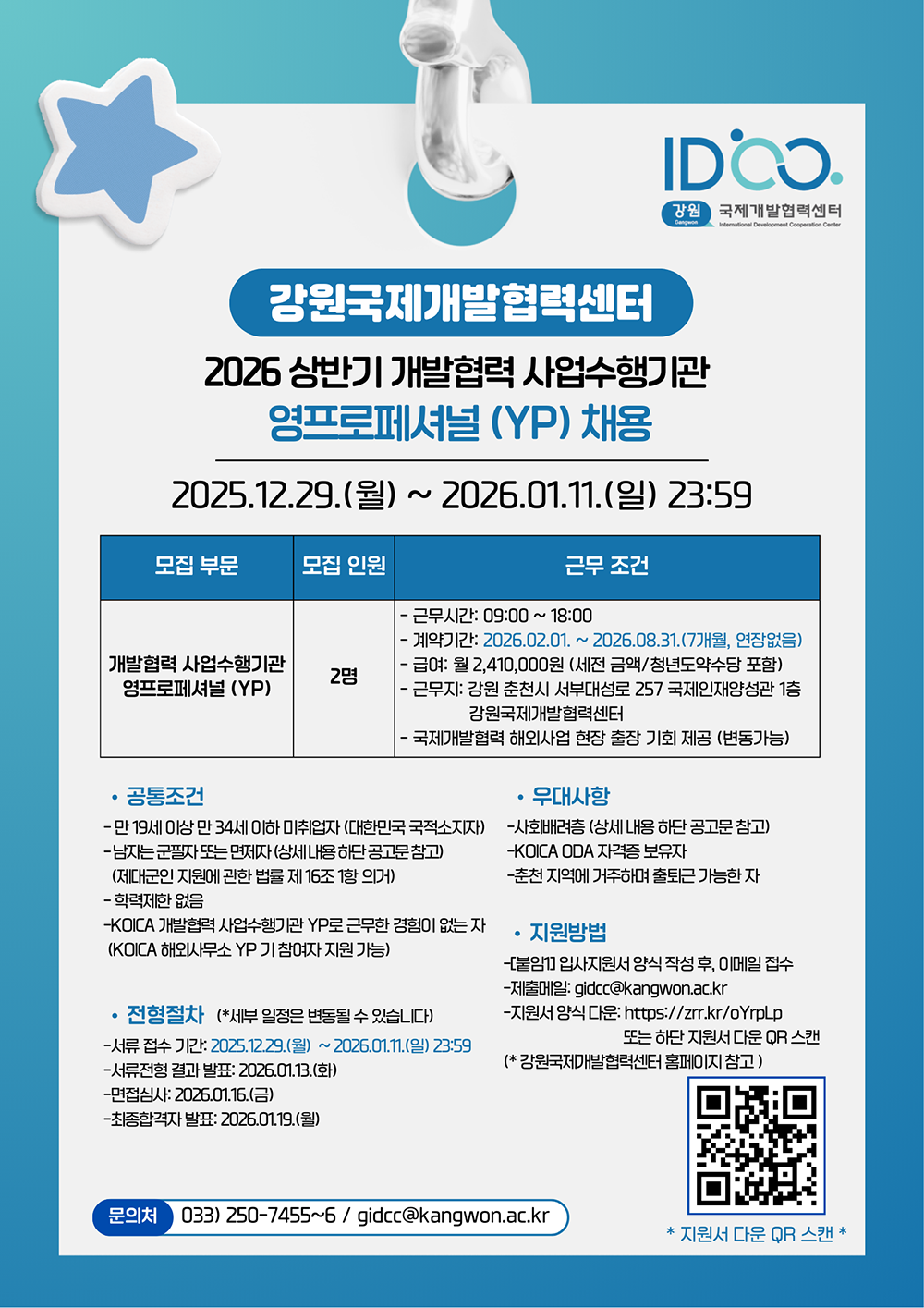 6. 지원 방법: 강원국제개발협력센터 홈페이지 공지사항 및 홍보 포스터 QR 코드 스캔하여 양식 작성 후, 기관 메일 gidcc@kangwon.ac.kr로 발송 (메일 제목: 개발협력 YP_이름)