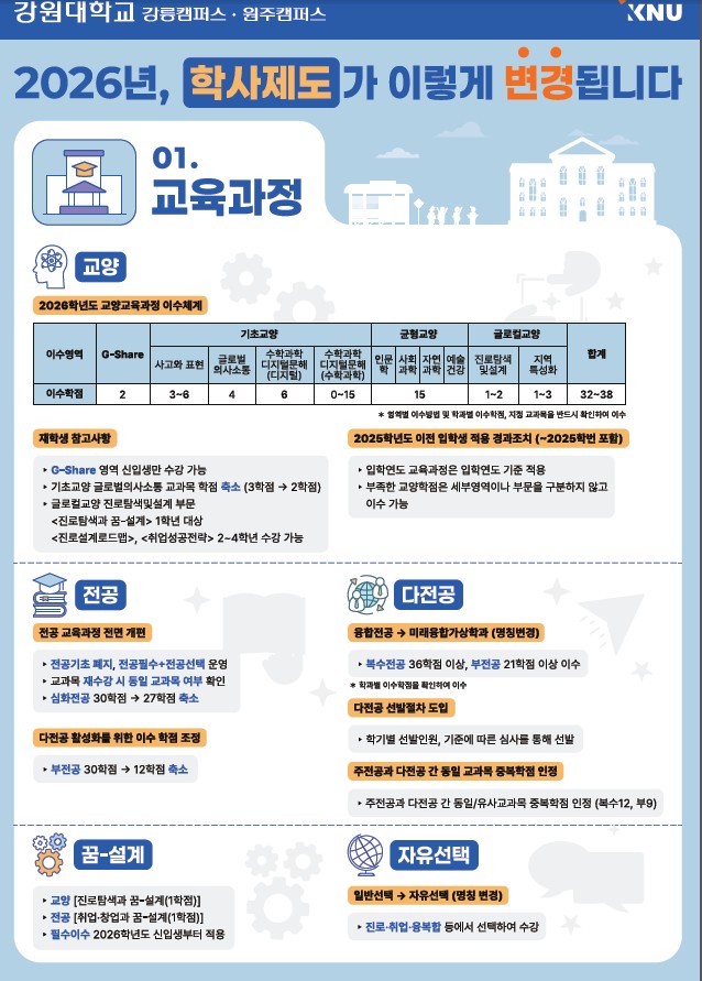 fnctId=bbs,fnctNo=596 [공지]2026년 통합 강원대학교 교육과정및 학사제도 안내 작성일 2026.02.27 작성자 최수진 조회수 212 첨부파일 2026년 통합 강원대학교 교육과정및 학사제도 안내.pdf